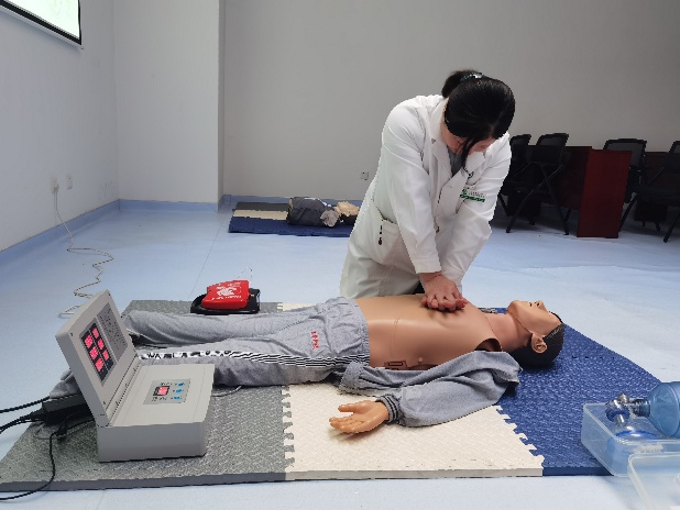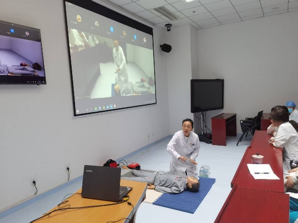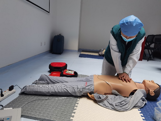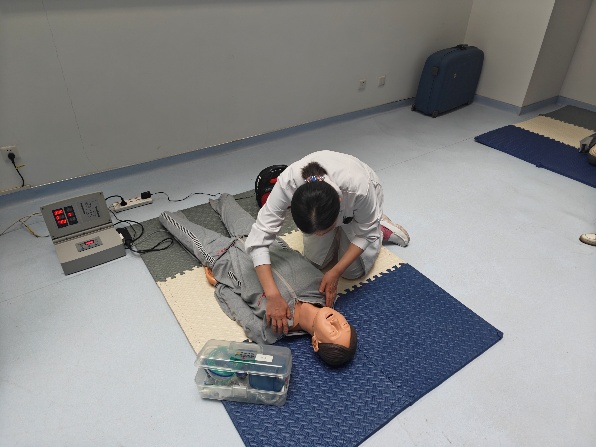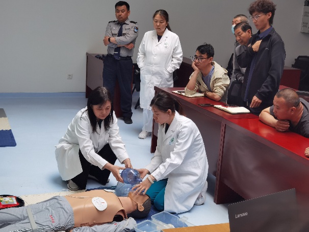 校医院先期派出业务骨干参加北京市海淀区医学救援中心组织的急救培训,之后将规范的心肺复苏核心理论、操作技能与流程进行全员培训。培训分理论讲解、操作演示、实践操作环节。理论讲解着重心肺复苏流程和高质量复苏要素,清晰梳理每一个知识点。操作演示中准确示范、拆分解读每一个动作的要点和细节。大家争先恐后进行实践操作,反复练习,力求动作精准无误。